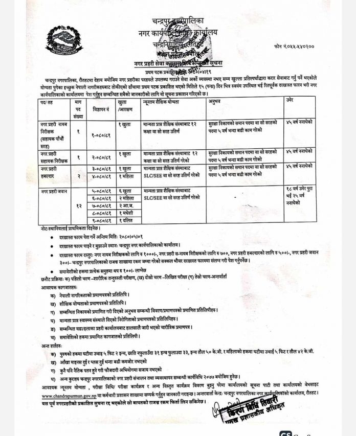 चन्द्रपुर नगरपालिकामा नगर प्रहरीको लागी आबेदन खुल्यो