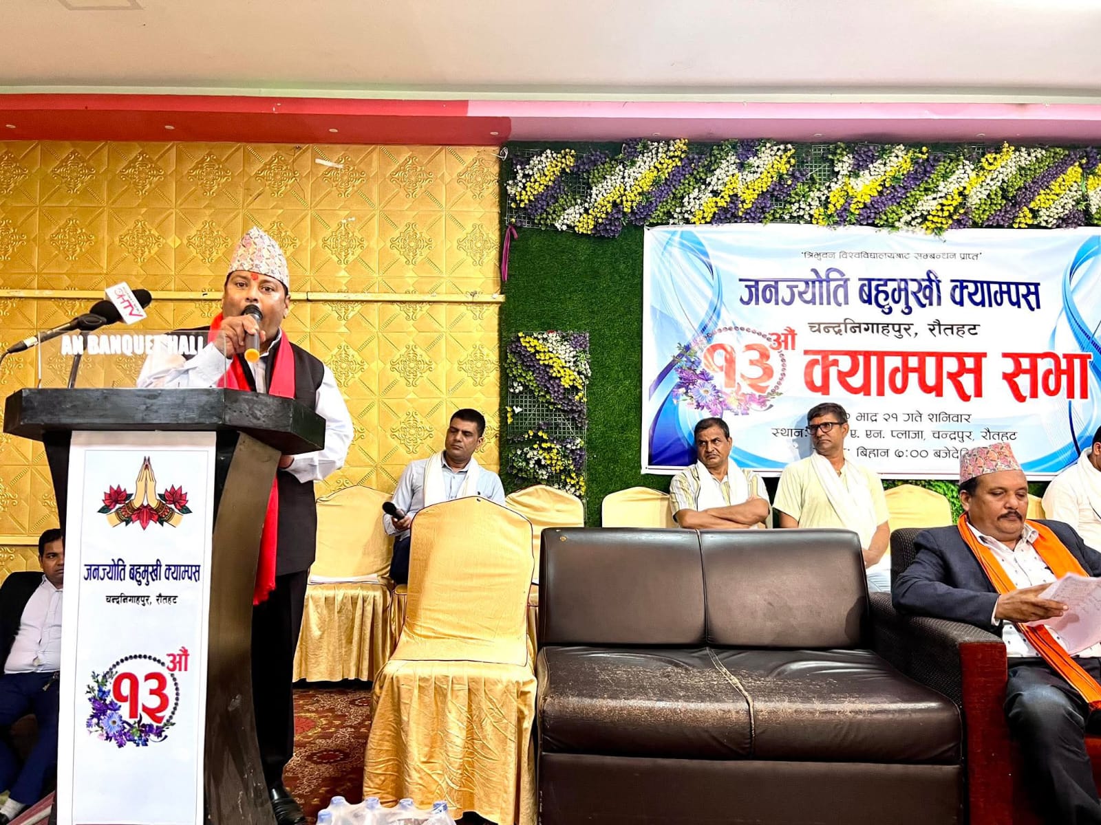 रौतहटको चन्द्रपुर नगरपालिकाका नगर प्रमुख संजय कुमार काफ्लेले चन्द्रनिगाहपुरमा रहेको जनज्योती बहुमुखी क्याम्पसको समग्र बिकाशको लागी चन्द्रपुर नगरपालिका सहयोग गर्न तत्पर रहेको बताउनु भएको छ । शनिबार क्याम्पसको १३ औँ बार्षिक सभाको उदघाटन गर्नुहुदै नगर प्रमुख काफ्लेले यस्तो बताउनु भएको हो । नगर प्रमुख काफलेले शिक्षाको विकासलाई नगरपालिकाले प्राथमिकतामा राखेको उल्लेख गर्दै आगामी दिनमा क्याम्पसलाई आवश्यक भौतिक पूर्वाधार, शैक्षिक गुणस्तर र अन्य शैक्षिक गतिविधिमा नगरपालिकाले अझ सक्रिय भूमिका खेल्ने बताउनु भयो । कार्यक्रमका प्रमुख अतिथि समेत रहनुभएका नगर प्रमुख काफ्लेले स्थानीय स्तरमै गुणस्तरीय शिक्षा उपलब्ध गराउन सामुदायिक क्याम्पसहरूको योगदान महत्वपूर्ण रहेको उहाँले बताउनुभयो । सभामा सचालक समितिको तर्फ बाट बार्षिक प्रतिबेदन प्रस्तुत गर्नुहुदै अध्यक्ष सञ्जय कार्कीले क्याम्पसले क्याम्पस लाई समय सापेक्ष अझै सुधार गर्दै लगिने बताउनु भयो । उहाको प्रतिबेदनमा प्रविधिमैत्री अध्ययन, आबश्यक्ताका आधारमा नयाँ विषय थप गर्ने, पुस्तकालय र प्रयोगशालाको विस्तार गरिदै लगिने रहेको छ । क्याम्पसको शैक्षिक अबस्था, भौतिक अबस्था, आर्थिक अबस्था, संस्थागत बिकास तथा ब्यबस्थापकीय अबस्थाको प्रतिबेदन सार्बजनिक गर्नु भएको छ । यस्तै क्याम्पस प्रम्ुख राजन श्रेष्ठले शैक्षिक सुधारकै कारण क्याम्पसमा भर्ना हुन आउने बिद्यार्थीको संख्या बढदै गएको प्रतिबेदनमा उल्लेख रहेको छ । प्रतिवेदनमा विद्यार्थीको संख्या वृद्धि, परीक्षाफलमा आएको सुधार, विभिन्न शैक्षिक तथा सह–शैक्षिक गतिविधिहरूको प्रगति र आन्तरिक व्यवस्थापनमा भएका उपलब्धिहरू प्रस्तुत गरिएको थियो । आगामी दिनमा शैक्षिक भबनको बाकी कार्यहरु पुरा गर्ने, आईसिटी कक्षाको ब्यबस्था गर्ने, छात्र छात्राहरुको लागि छुटाछुटै पोशाक पहिरन कक्ष बनाउने लगायत उल्लेख रहेको छ । कोषाध्यक्ष चिरन्जिबी गौतमले आय ब्यय बिबरण सहितको प्रतिबेदन प्रस्तुत गर्नु भएको थियो ।