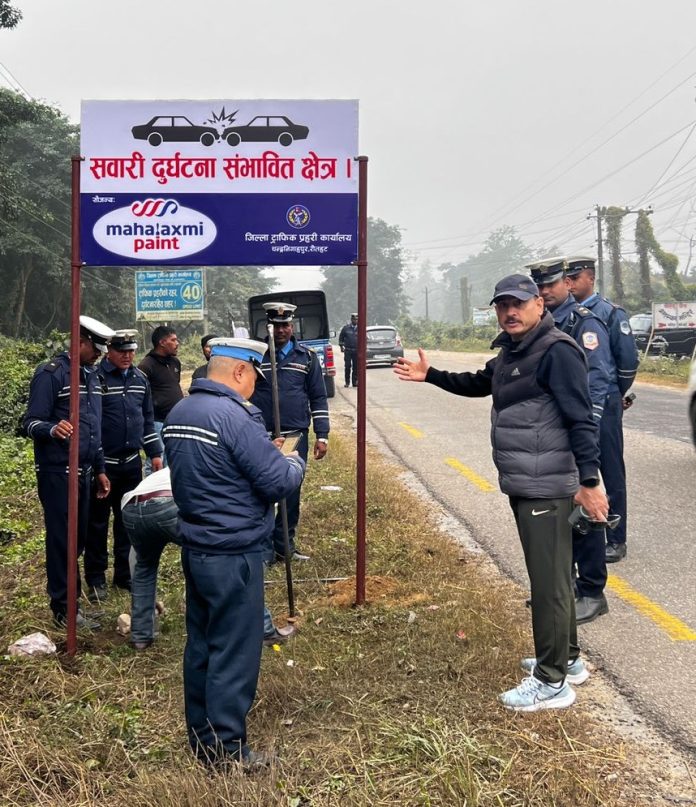 कार्ययोजना अनुसार रौतहट जिल्लाको पूर्व–पश्चिम राजमार्ग अन्तर्गत बागमती पुलदेखि बाराको सिमाना धन्सार पुलसम्म तथा चन्द्रनिगाहपुर–गौर सडकखण्डमा दुर्घटना न्यूनिकरणका लागि सचेतनामूलक बोर्डहरू स्थापना गरिएको ट्राफिक प्रहरी निरिक्षक थापामगरले जानकारी दिनुभयो । महालक्ष्मी पेन्ट उद्योग, काठमाडौंको सहकार्यमा प्राप्त ट्राफिक सडक सामग्री अन्तर्गत १८ थान सचेतनामूलक बोर्ड सडक छेउछाउमा जडान गरिएको उहाले बताउनु भयो । सवारी र्दुघटना न्युनिकरणको लागी बिभिन्न बिद्यालय,कलेजहरुमा समेत सचेतनामुलक कार्यक्रमहरु गरिने प्रहरी निरिक्षक थापा मगरले बताउनु भएको छ ।सवारी र्दुघटना न्युनिकरण गर्ने उदेश्यले सचेतनामूलक बोर्ड स्थापना गरिएको नेपाल प्रहरी राजमार्ग सुरक्षा तथा ट्राफिक व्यवस्थापन कार्यालय, पथलैया बाराका कार्यालय प्रमुख प्रहरी उपरीक्षक राजकुमार सिलवालले बताउनु भएको छ । बढदो सवारी साधन र्दुघटनालाइ न्युनिकरण गर्न यस्ता कार्यक्रमले सहयोग पुग्ने प्रहरी उपरिक्षक सिलवालले बताउनु भयो ।